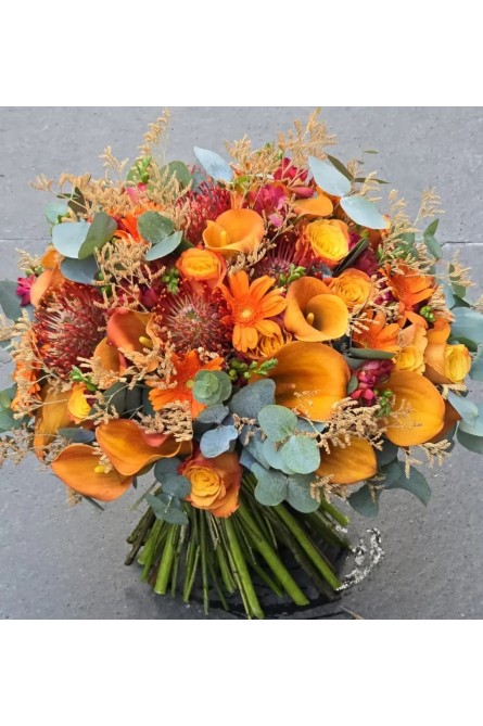 Bouquet camaïeu de orange composé de fleurs et feuillage de saison.